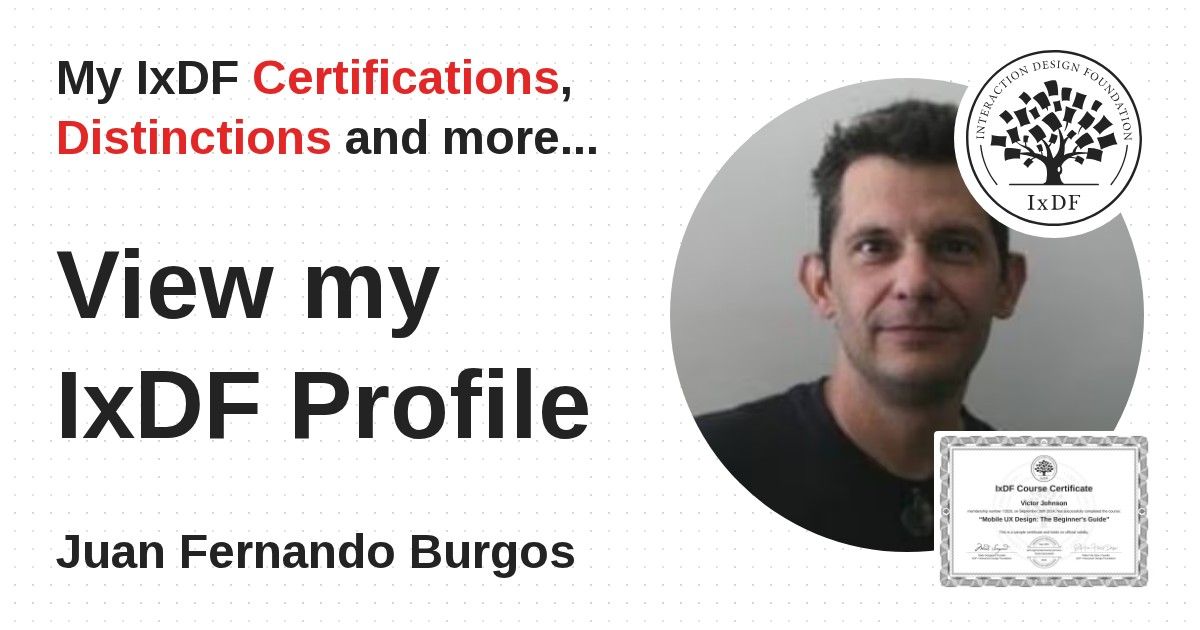 IxDF Course Certificates are awarded to Juan Fernando Burgos in formal recognition of their coursework surpassing the rigorous benchmarks of exceptional performance established by the IxDF Educational Codex.