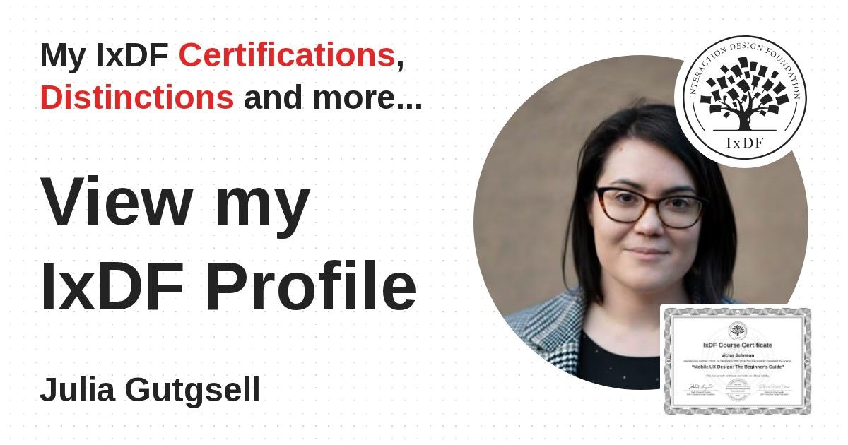 IxDF Course Certificates are awarded to Julia Gutgsell in formal recognition of their coursework surpassing the rigorous benchmarks of exceptional performance established by the IxDF Educational Codex.
