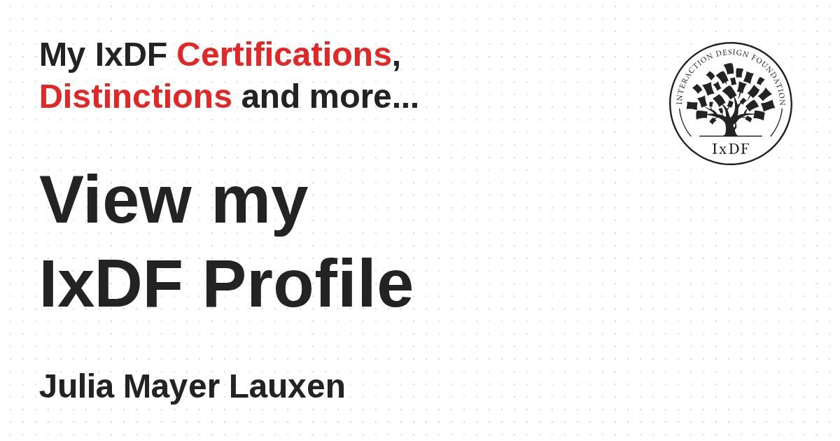 IxDF Course Certificates are awarded to Julia Mayer Lauxen in formal recognition of their coursework surpassing the rigorous benchmarks of exceptional performance established by the IxDF Educational Codex.