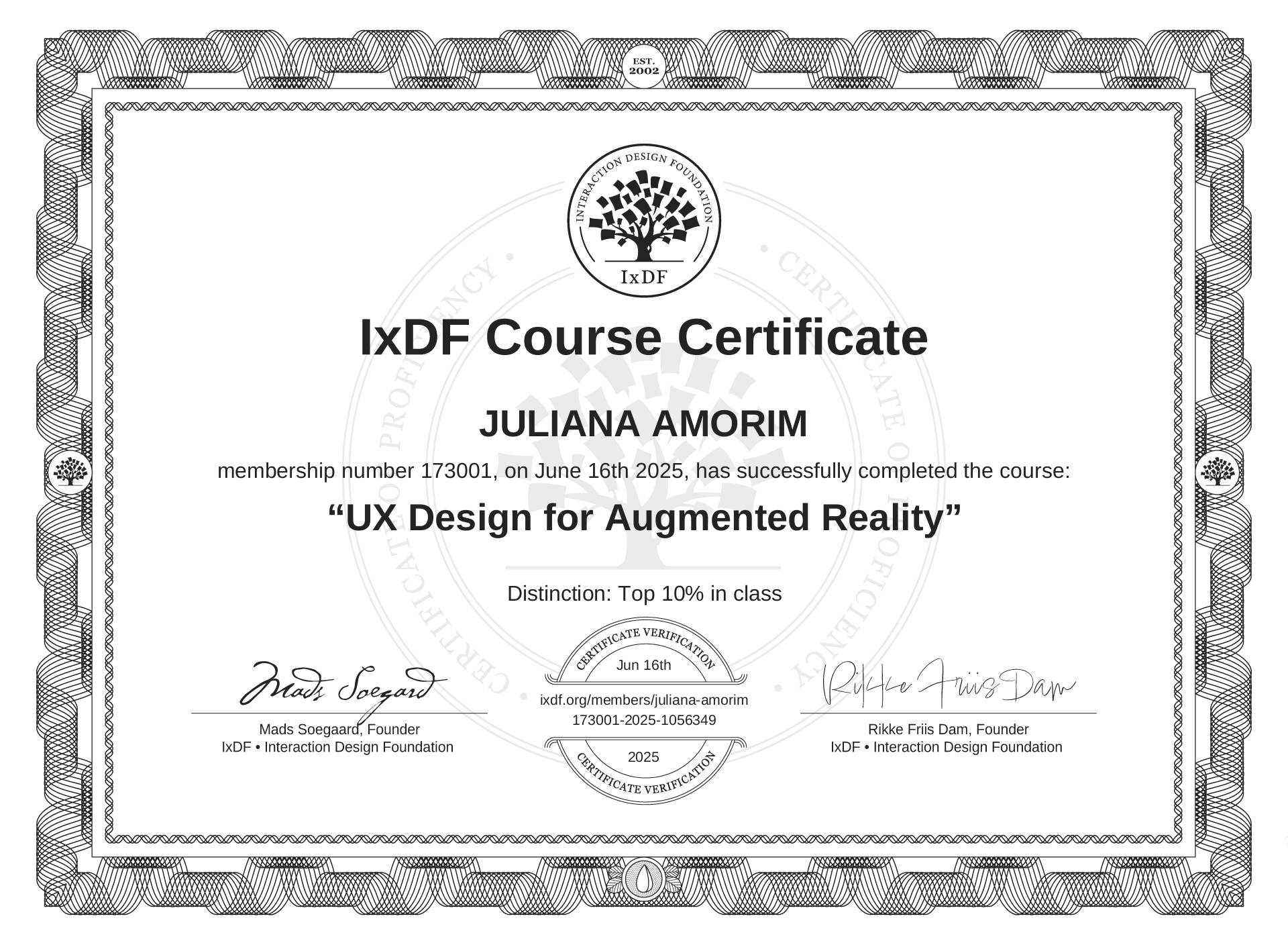 The IxDF Course Certificate (ID #1e911da8-524c-4f6c-bfb8-b95fdb62834e) above is awarded to JULIANA AMORIM