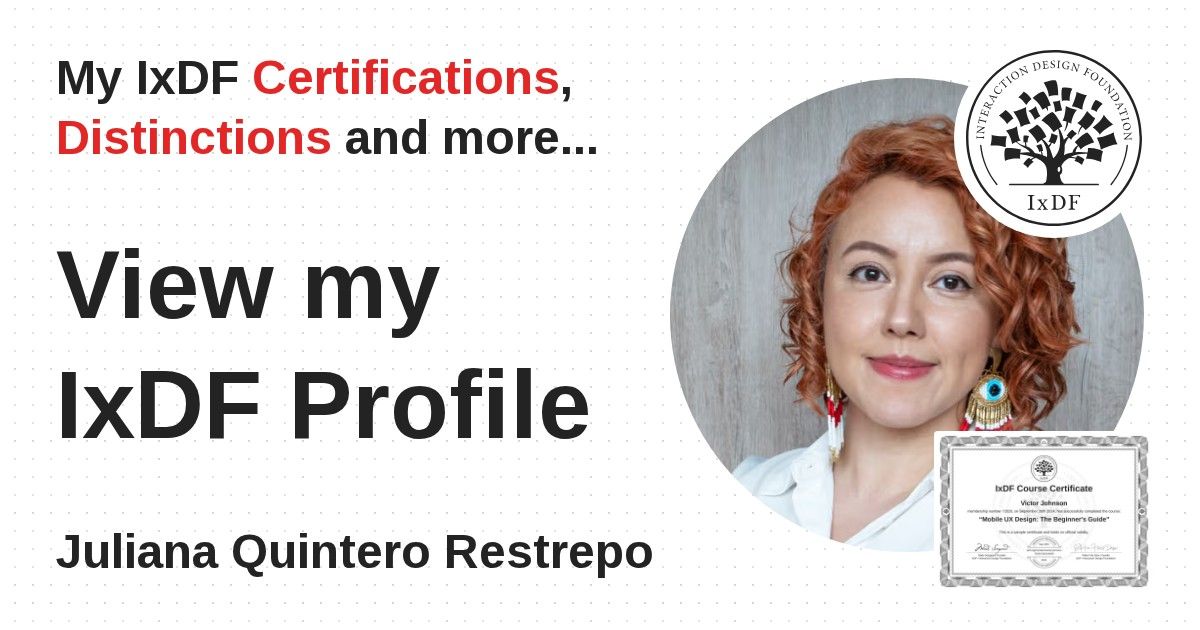 IxDF Course Certificates are awarded to Juliana Quintero Restrepo in formal recognition of their coursework surpassing the rigorous benchmarks of exceptional performance established by the IxDF Educational Codex.