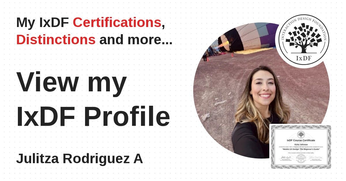 IxDF Course Certificates are awarded to Julitza Rodriguez A in formal recognition of their coursework surpassing the rigorous benchmarks of exceptional performance established by the IxDF Educational Codex.