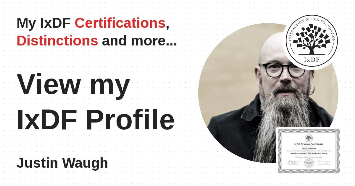 IxDF Course Certificates are awarded to Justin Waugh in formal recognition of their coursework surpassing the rigorous benchmarks of exceptional performance established by the IxDF Educational Codex.