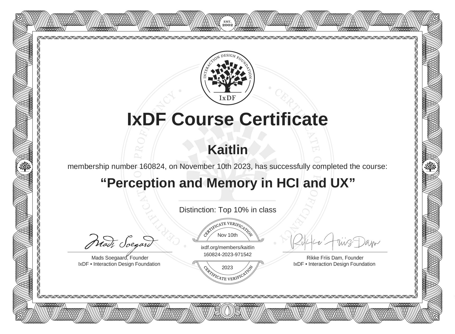The IxDF Course Certificate (ID #0e04d74c-3030-48e8-ac04-0e18dd620d26) above is awarded to Kaitlin with a Top 10% Distinction in formal recognition of their coursework surpassing the rigorous benchmarks of exceptional performance established by the IxDF Educational Codex. View Course Curriculum.