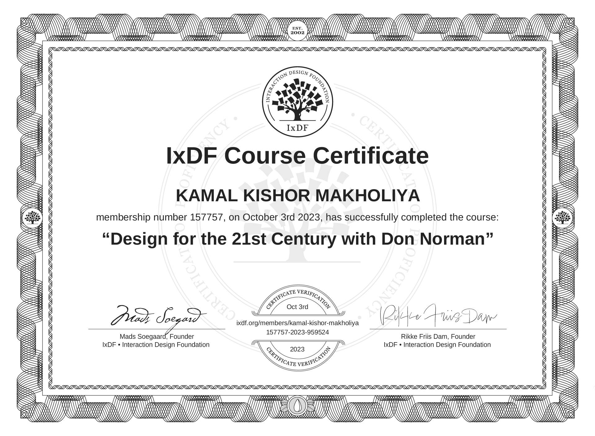 The IxDF Course Certificate (ID #e6a54c60-8aa5-4912-be26-41fb038765f2) above is awarded to KAMAL KISHOR MAKHOLIYA in formal recognition of their coursework surpassing the rigorous benchmarks of exceptional performance established by the IxDF Educational Codex. View Course Curriculum.