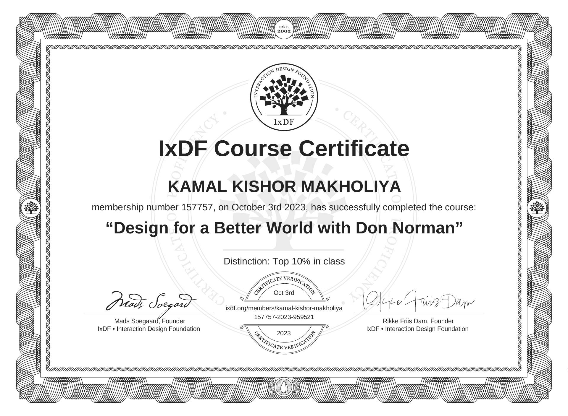 IxDF Course Certificate awarded to KAMAL KISHOR MAKHOLIYA for completing the "Design for a Better World with Don Norman" course