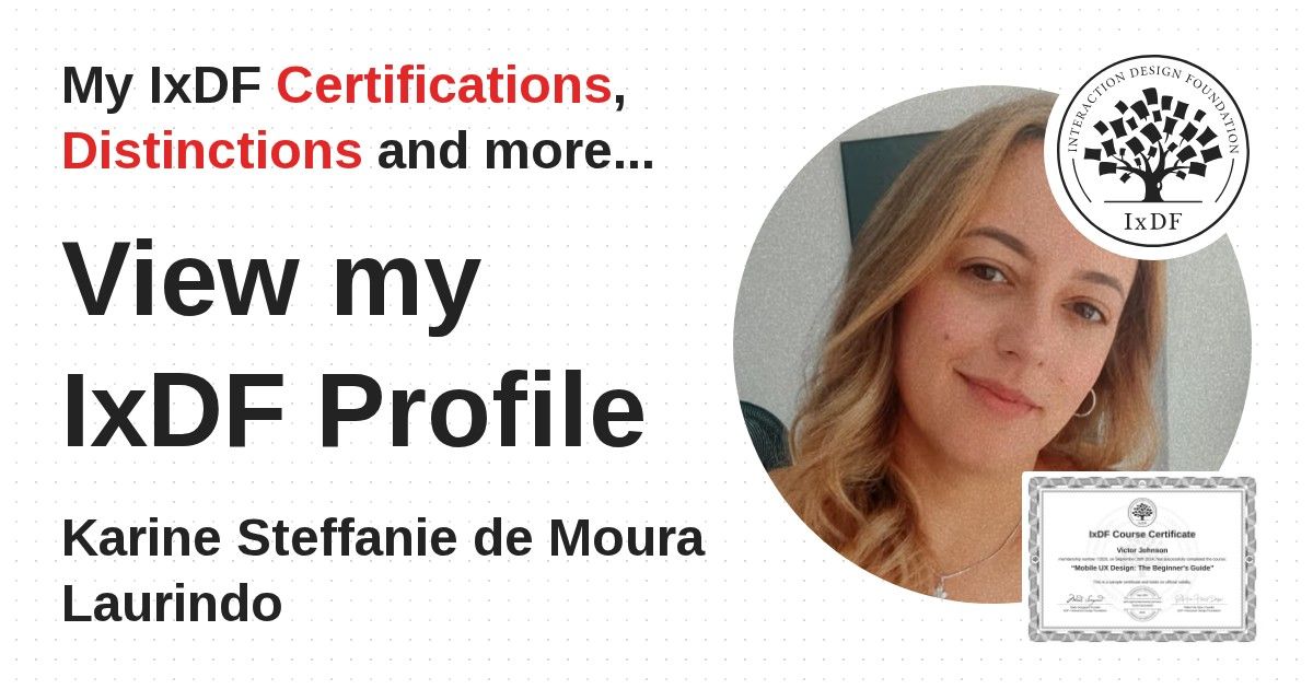 IxDF Course Certificates are awarded to Karine Steffanie de Moura Laurindo in formal recognition of their coursework surpassing the rigorous benchmarks of exceptional performance established by the IxDF Educational Codex.