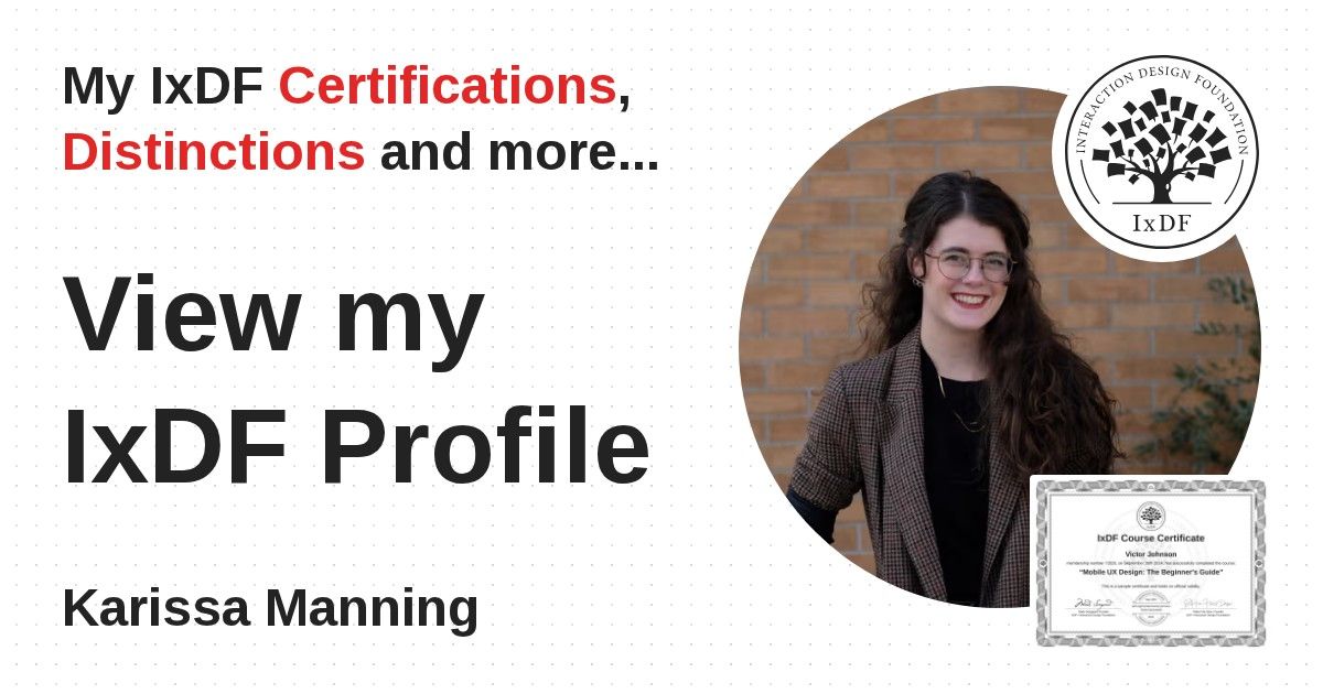 IxDF Course Certificates are awarded to Karissa Manning in formal recognition of their coursework surpassing the rigorous benchmarks of exceptional performance established by the IxDF Educational Codex.
