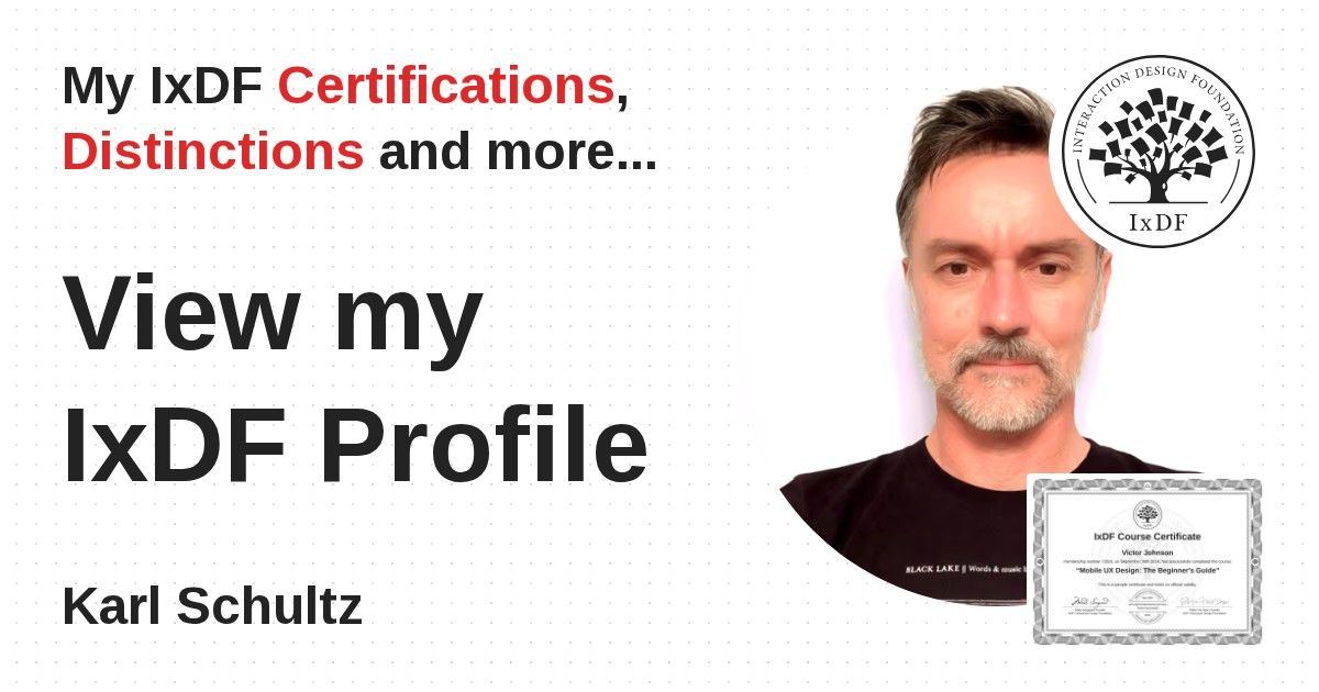 IxDF Course Certificates are awarded to Karl Schultz in formal recognition of their coursework surpassing the rigorous benchmarks of exceptional performance established by the IxDF Educational Codex.