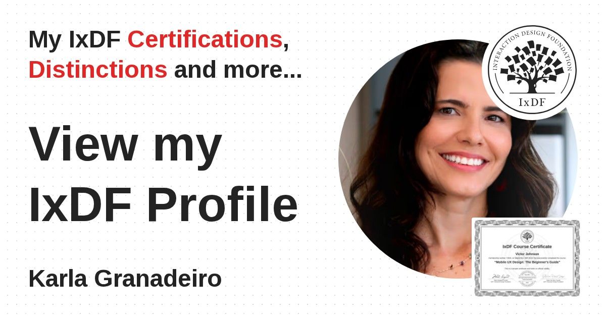IxDF Course Certificates are awarded to Karla Granadeiro in formal recognition of their coursework surpassing the rigorous benchmarks of exceptional performance established by the IxDF Educational Codex.