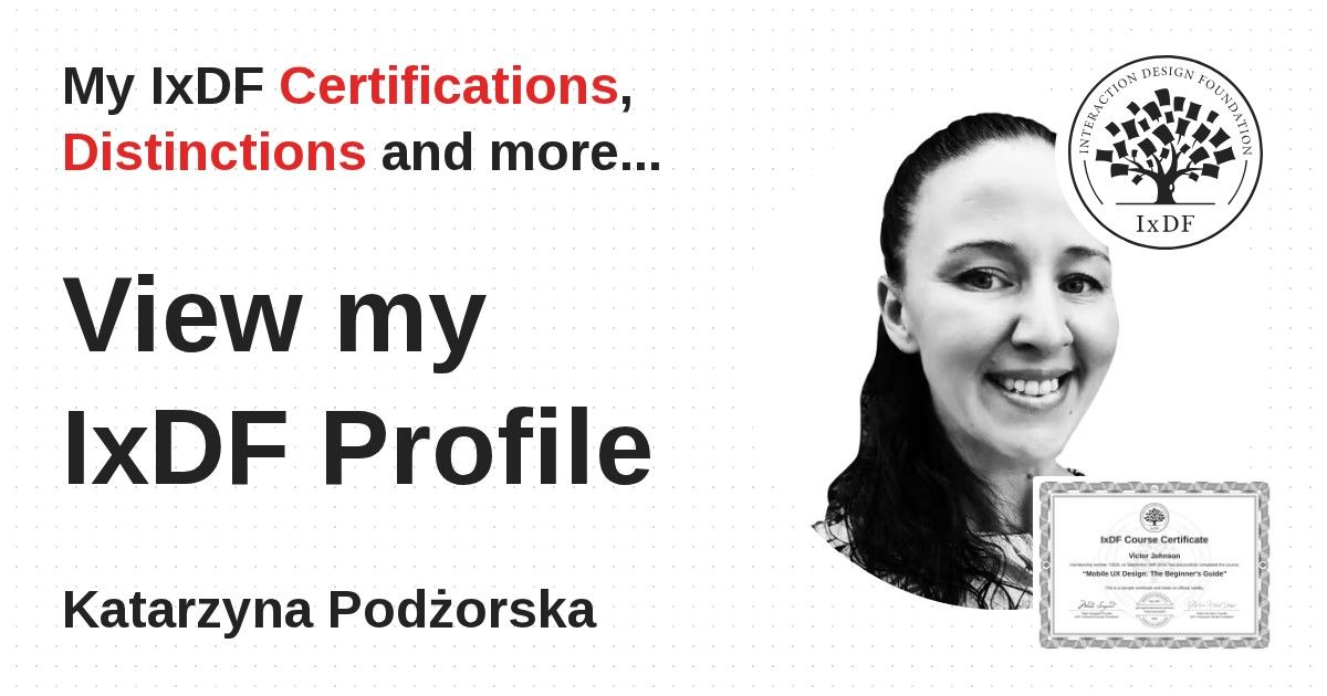 IxDF Course Certificates are awarded to Katarzyna Podżorska in formal recognition of their coursework surpassing the rigorous benchmarks of exceptional performance established by the IxDF Educational Codex.