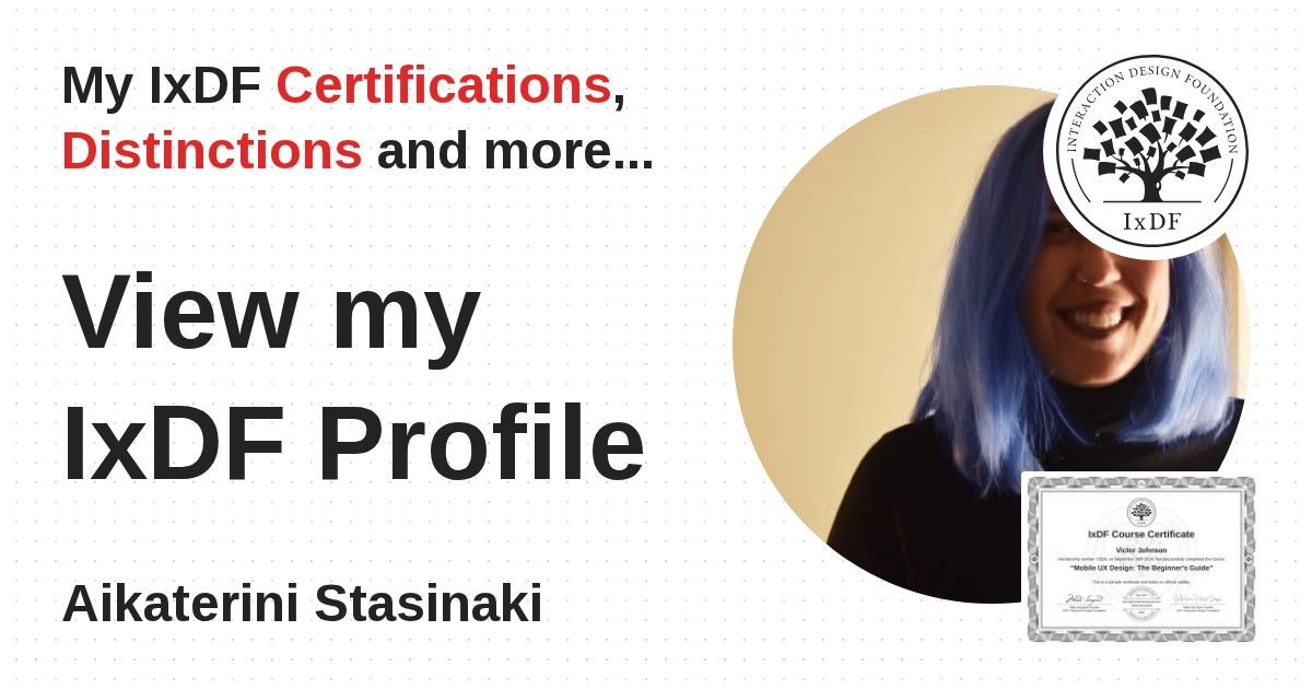 IxDF Course Certificates are awarded to Aikaterini Stasinaki in formal recognition of their coursework surpassing the rigorous benchmarks of exceptional performance established by the IxDF Educational Codex.