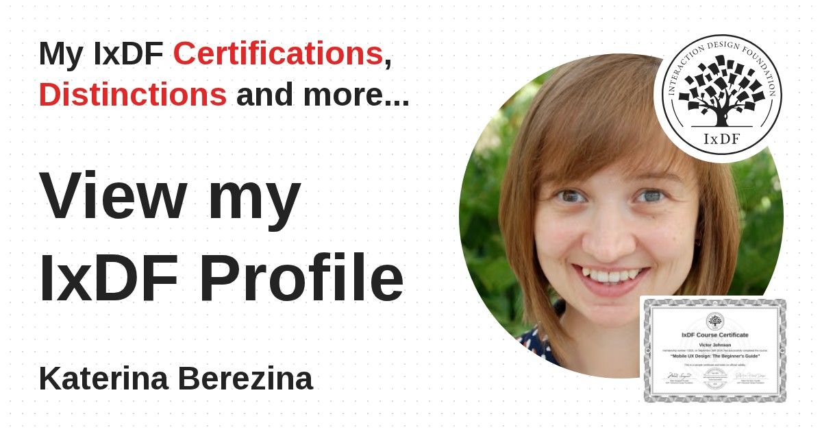 IxDF Course Certificates are awarded to Katerina Berezina in formal recognition of their coursework surpassing the rigorous benchmarks of exceptional performance established by the IxDF Educational Codex.