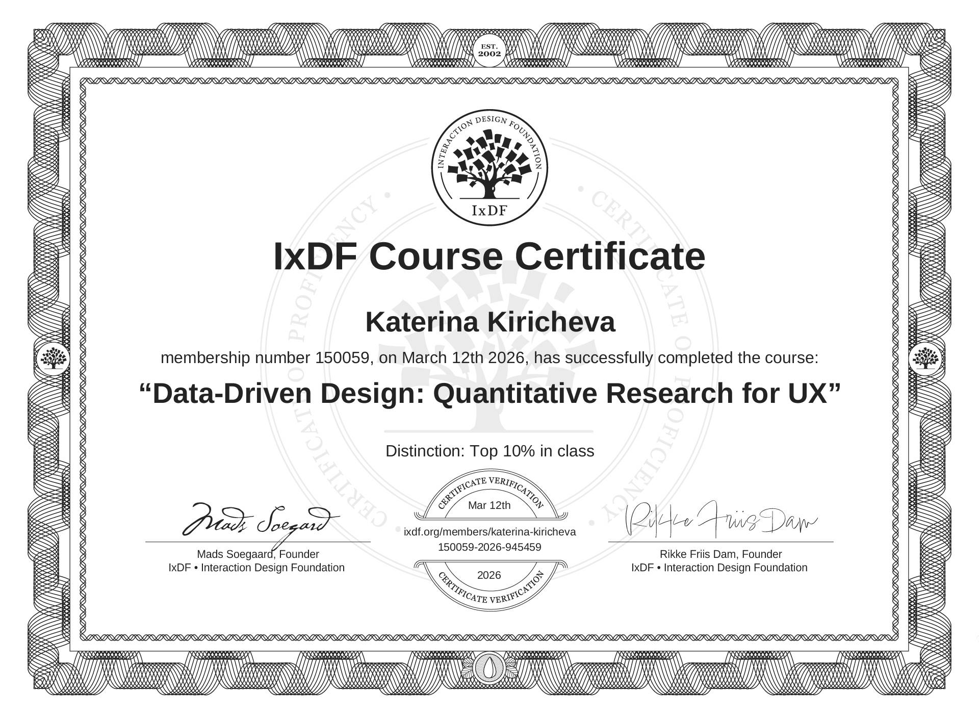 The IxDF Course Certificate (ID #df6da089-fac4-41ba-afac-f5c565fe6f25) above is awarded to Katerina Kiricheva with a Top 10% Distinction in formal recognition of their coursework surpassing the rigorous benchmarks of exceptional performance established by the IxDF Educational Codex. View Course Curriculum.