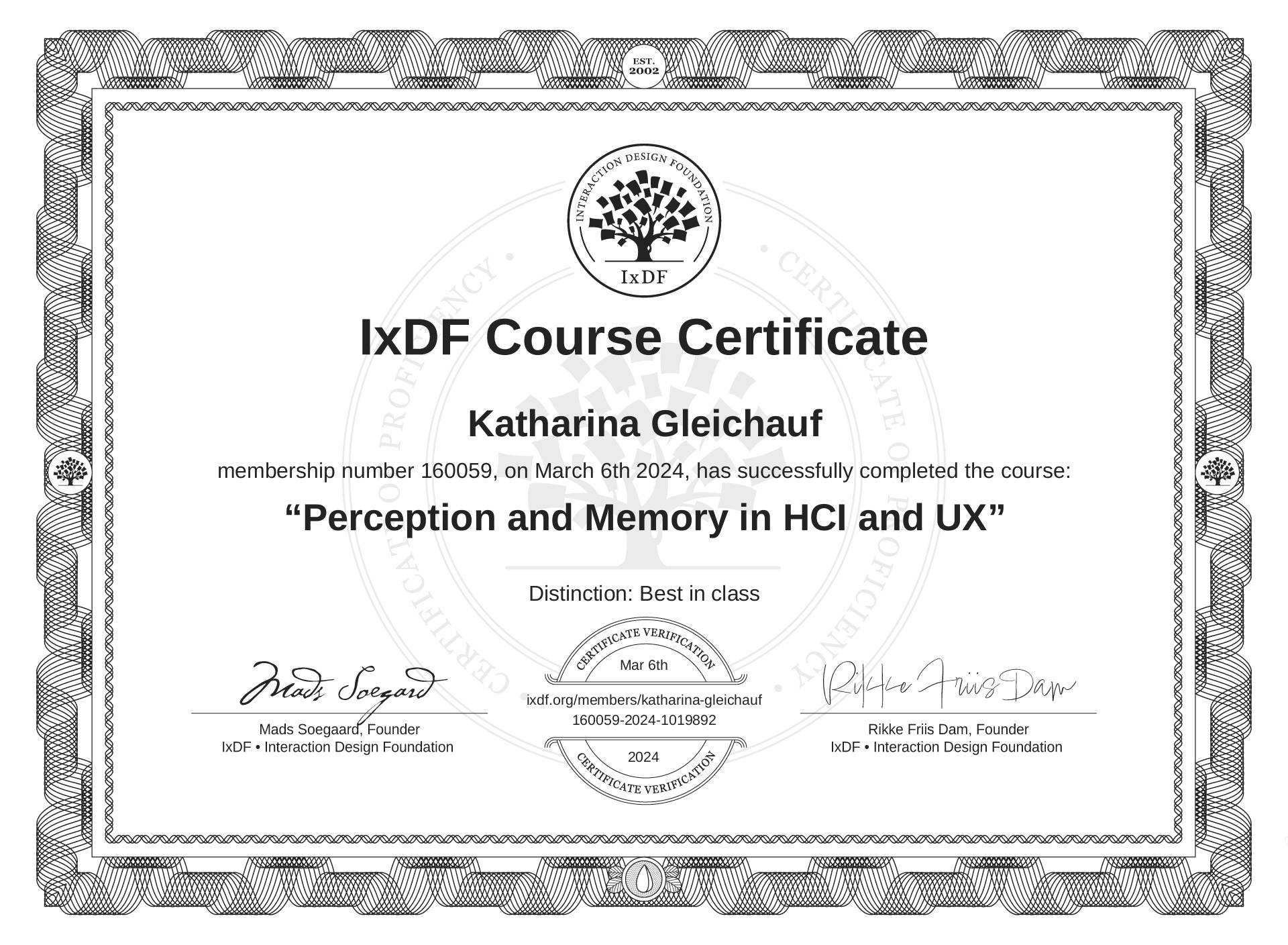 IxDF Course Certificate awarded to Katharina Gleichauf for completing the "Perception and Memory in HCI and UX" course