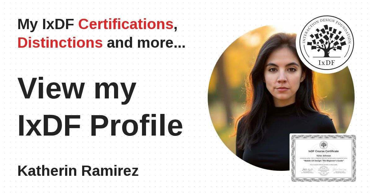 IxDF Course Certificates are awarded to Katherin Ramirez in formal recognition of their coursework surpassing the rigorous benchmarks of exceptional performance established by the IxDF Educational Codex.