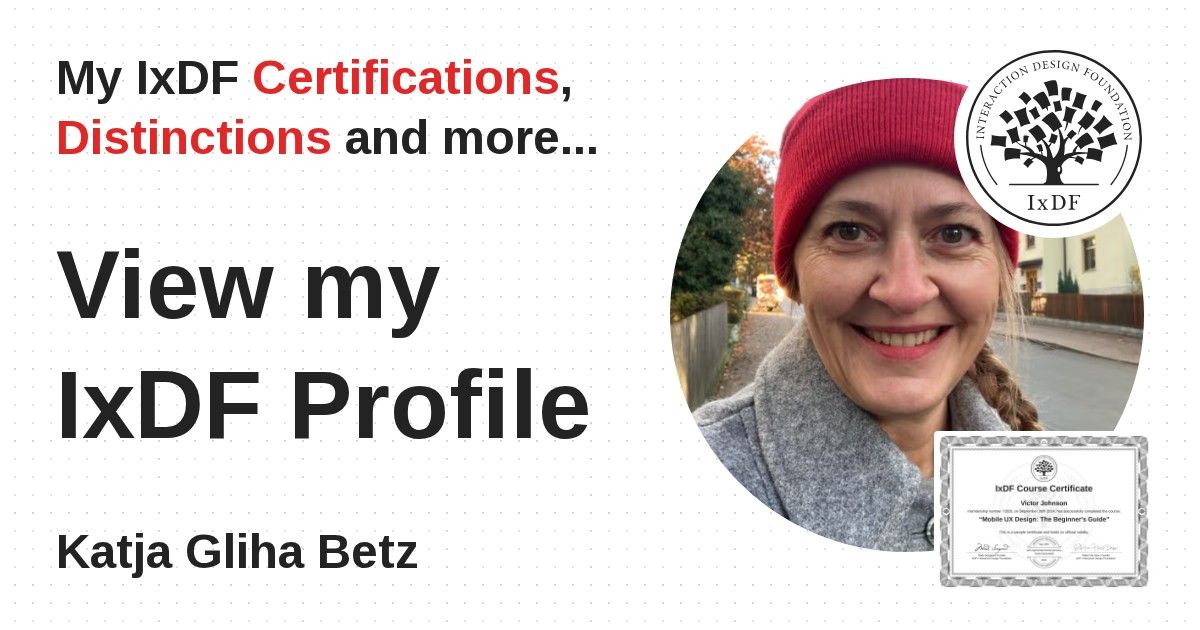 IxDF Course Certificates are awarded to Katja Gliha Betz in formal recognition of their coursework surpassing the rigorous benchmarks of exceptional performance established by the IxDF Educational Codex.