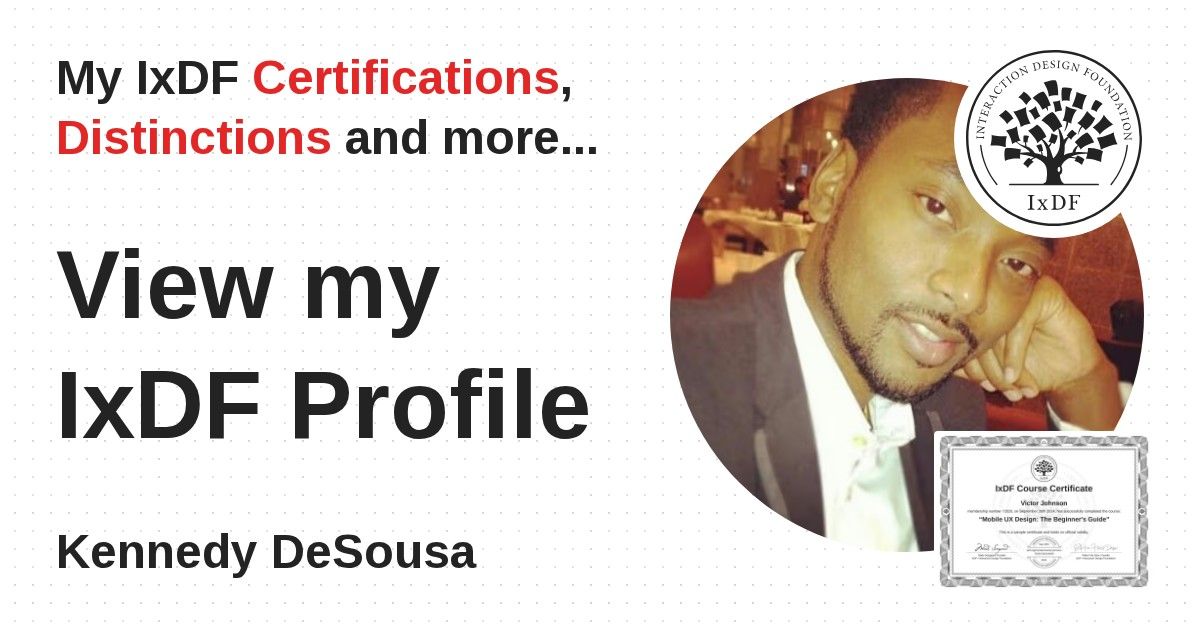 IxDF Course Certificates are awarded to Kennedy DeSousa in formal recognition of their coursework surpassing the rigorous benchmarks of exceptional performance established by the IxDF Educational Codex.