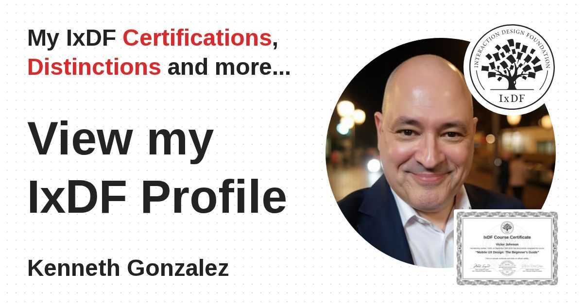 IxDF Course Certificates are awarded to Kenneth Gonzalez in formal recognition of their coursework surpassing the rigorous benchmarks of exceptional performance established by the IxDF Educational Codex.