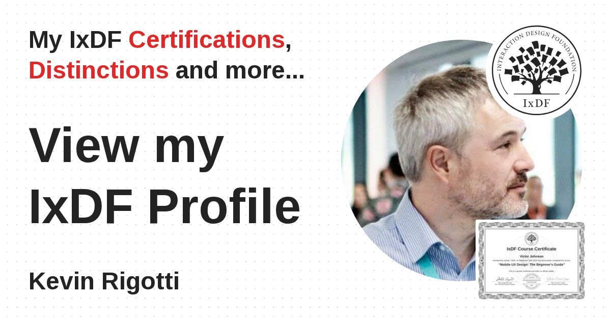 IxDF Course Certificates are awarded to Kevin Rigotti in formal recognition of their coursework surpassing the rigorous benchmarks of exceptional performance established by the IxDF Educational Codex.