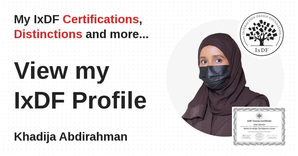 IxDF Course Certificates are awarded to Khadija Abdirahman in formal recognition of their coursework surpassing the rigorous benchmarks of exceptional performance established by the IxDF Educational Codex.