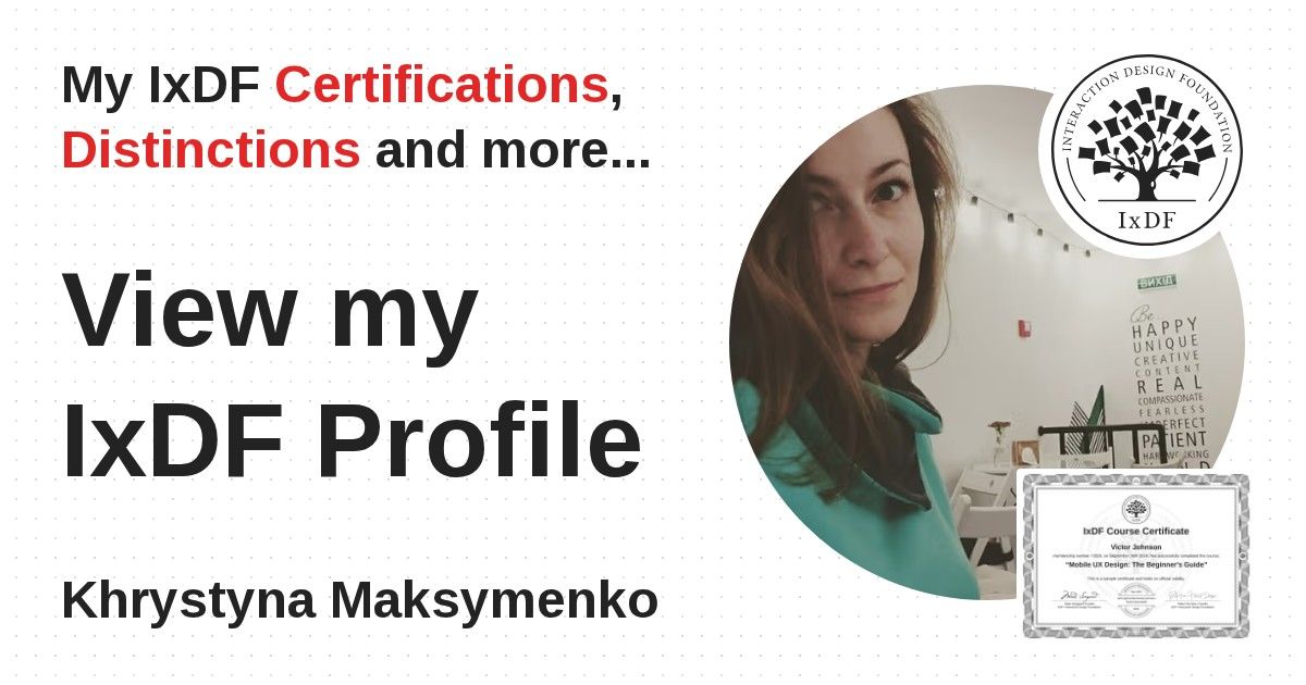 IxDF Course Certificates are awarded to Khrystyna Maksymenko in formal recognition of their coursework surpassing the rigorous benchmarks of exceptional performance established by the IxDF Educational Codex.