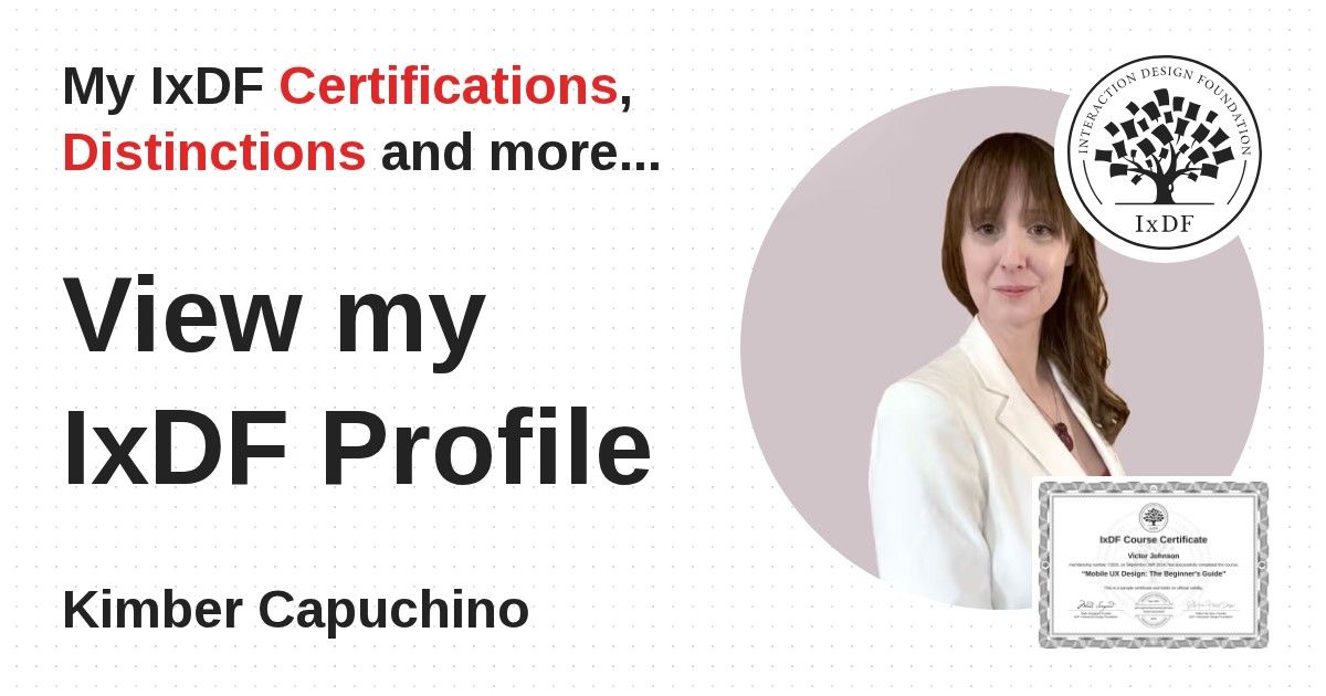 IxDF Course Certificates are awarded to Kimber Capuchino in formal recognition of their coursework surpassing the rigorous benchmarks of exceptional performance established by the IxDF Educational Codex.