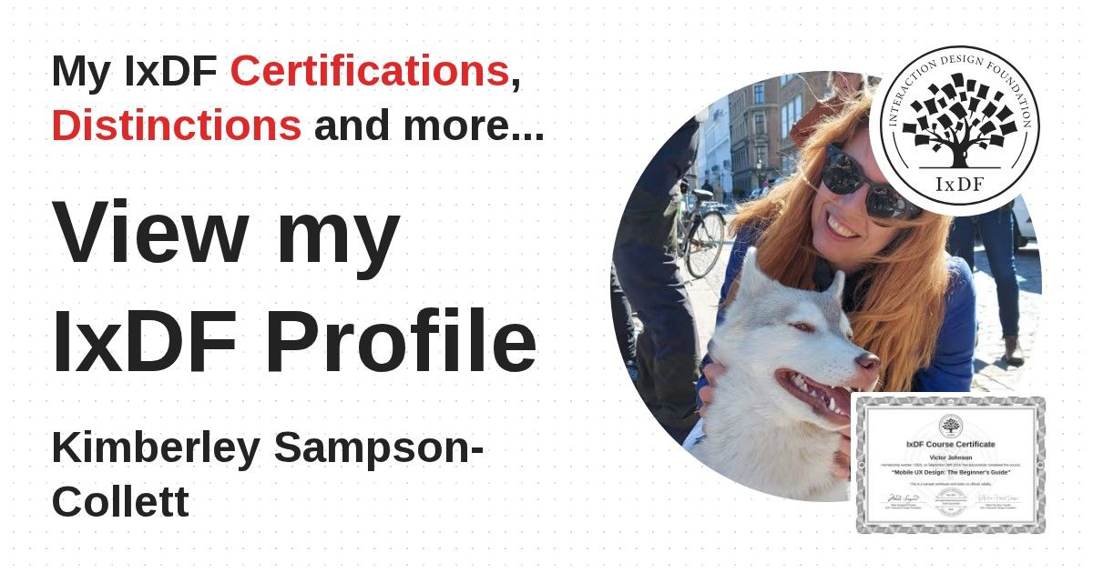 IxDF Course Certificates are awarded to Kimberley Sampson-Collett in formal recognition of their coursework surpassing the rigorous benchmarks of exceptional performance established by the IxDF Educational Codex.