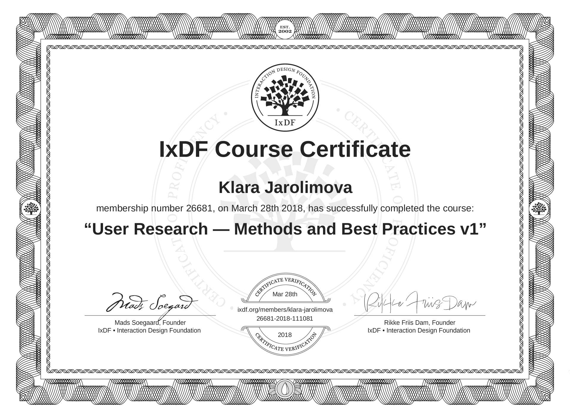 Klara Jarolimova's Course Certificate: User Research — Methods and Best Practices v1