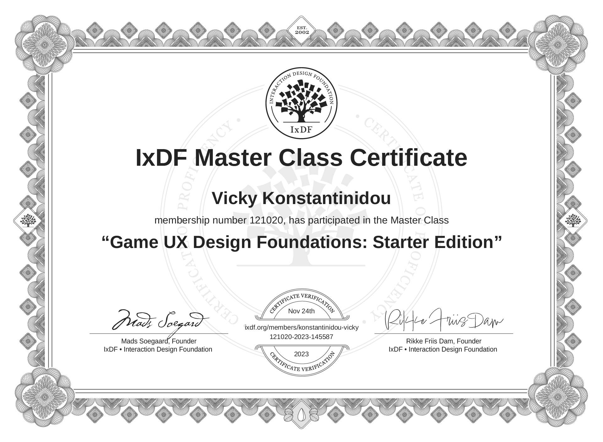 IxDF Master Class Certificates are awarded to Vicky Konstantinidou in formal recognition of their attendance and ongoing commitment to learning from industry leaders.
