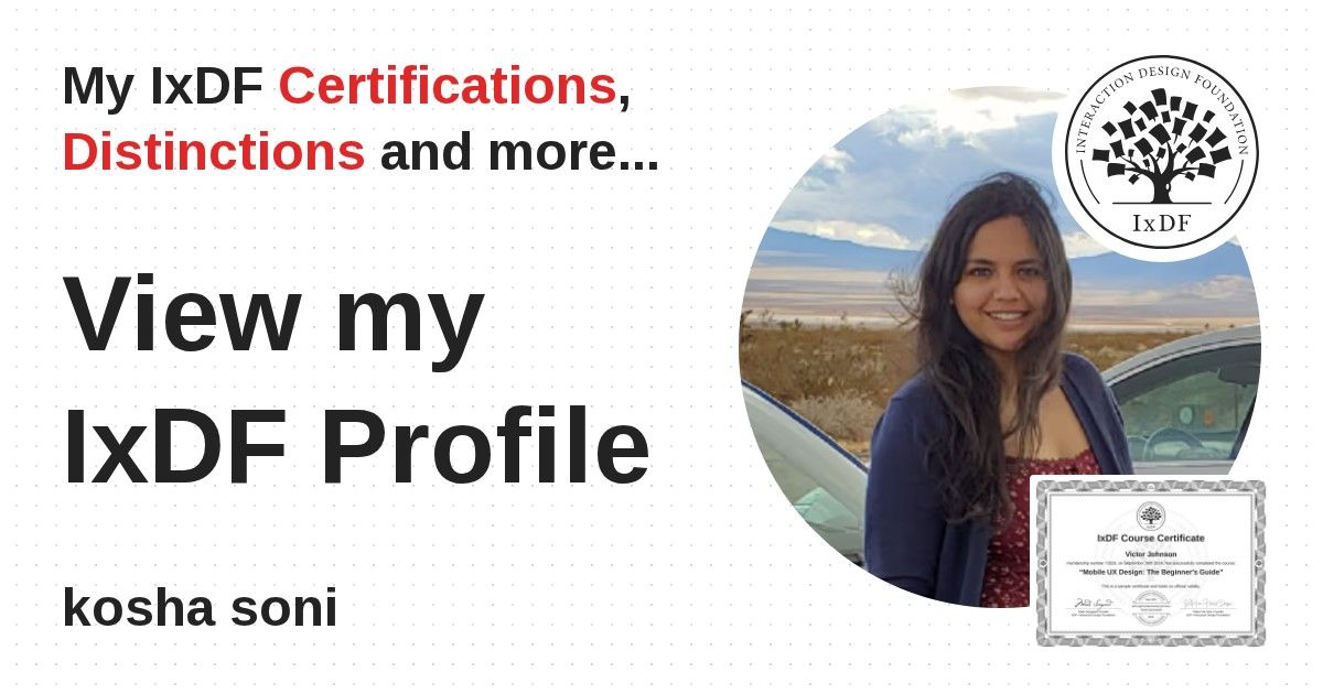 IxDF Course Certificates are awarded to kosha soni in formal recognition of their coursework surpassing the rigorous benchmarks of exceptional performance established by the IxDF Educational Codex.