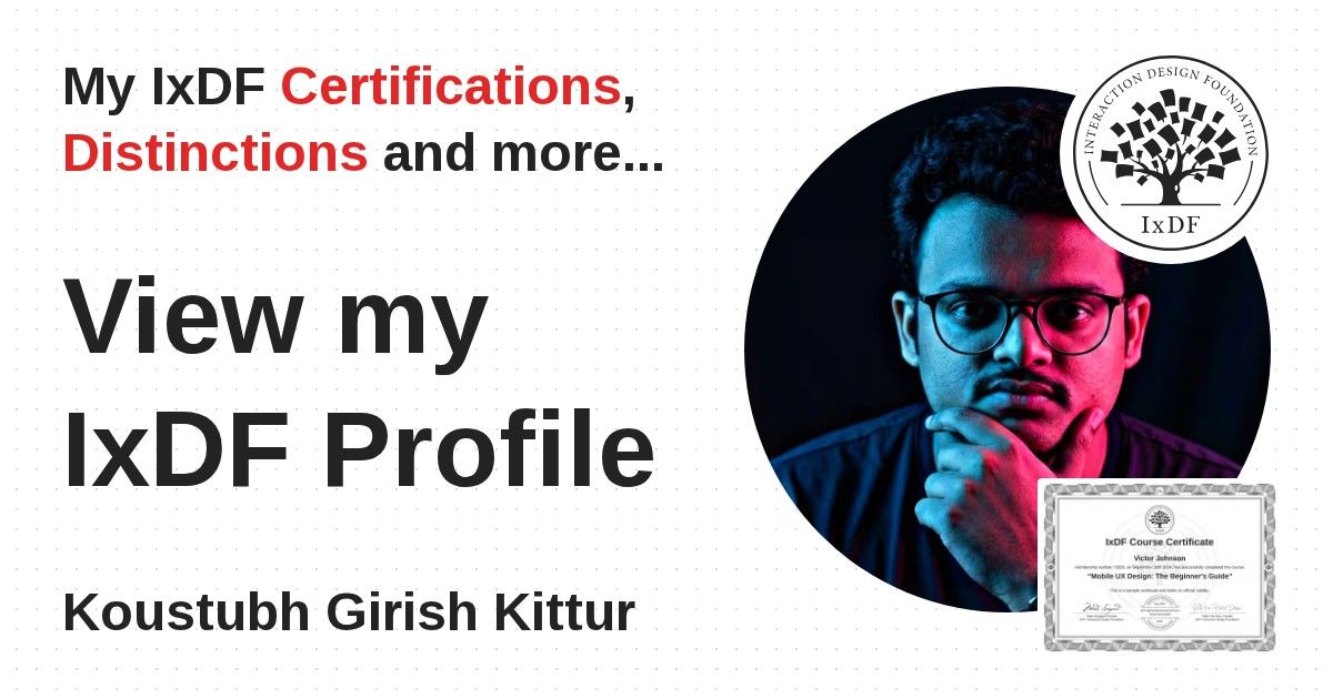 Distinctions are conferred upon Koustubh Girish Kittur in formal recognition of their notable achievements and contributions, as stipulated by the IxDF Educational Codex.