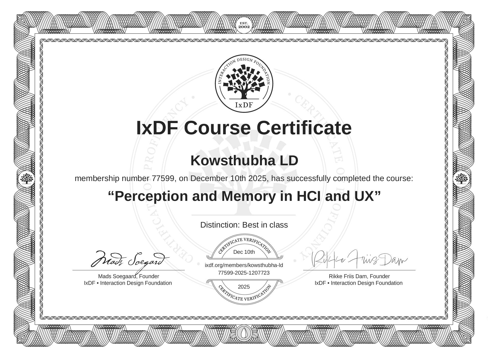 The IxDF Course Certificate (ID #af985b5c-8439-4740-9552-43f612db0f70) above is awarded to Kowsthubha LD