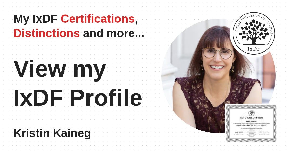 IxDF Course Certificates are awarded to Kristin Kaineg in formal recognition of their coursework surpassing the rigorous benchmarks of exceptional performance established by the IxDF Educational Codex.