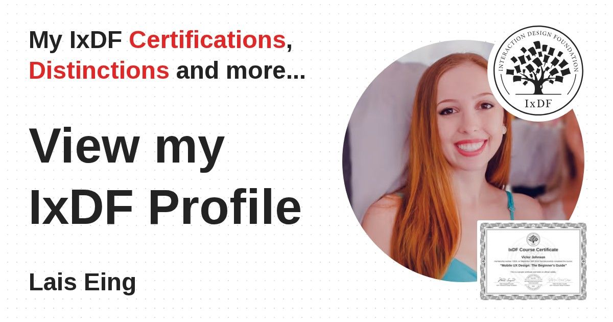 IxDF Course Certificates are awarded to Lais Eing in formal recognition of their coursework surpassing the rigorous benchmarks of exceptional performance established by the IxDF Educational Codex.