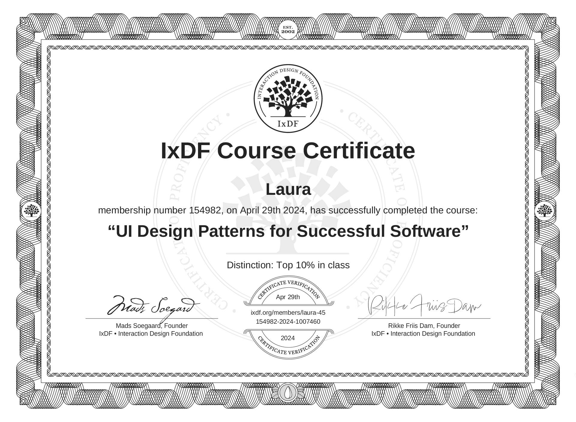 The IxDF Course Certificate (ID #5ed8a0bc-a2c3-4b14-a1e9-c1d6f90001e0) above is awarded to Laura with a Top 10% Distinction in formal recognition of their coursework surpassing the rigorous benchmarks of exceptional performance established by the IxDF Educational Codex. View Course Curriculum.