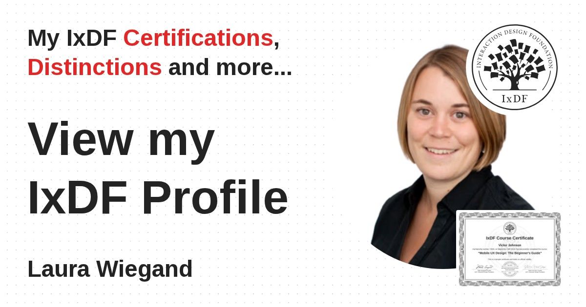 IxDF Course Certificates are awarded to Laura Wiegand in formal recognition of their coursework surpassing the rigorous benchmarks of exceptional performance established by the IxDF Educational Codex.