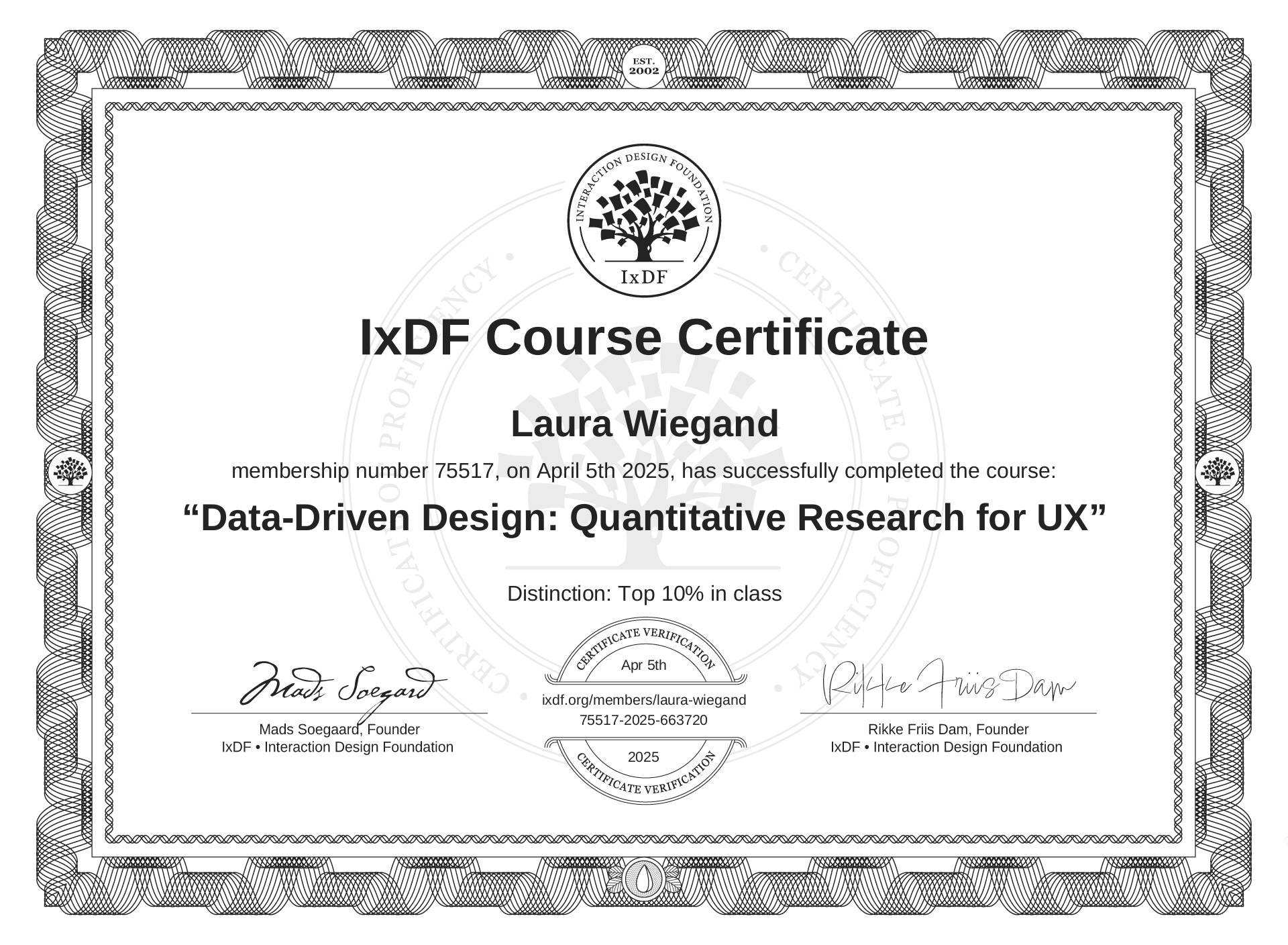 The IxDF Course Certificate (ID #9ca59cbd-b0dc-474f-98d0-ca8b1dde7ac5) above is awarded to Laura Wiegand with a Top 10% Distinction in formal recognition of their coursework surpassing the rigorous benchmarks of exceptional performance established by the IxDF Educational Codex. View Course Curriculum.