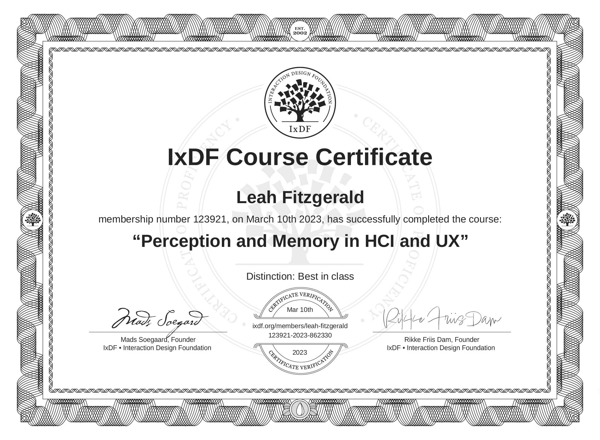 This IxDF Membership Certificate is issued to Leah Fitzgerald