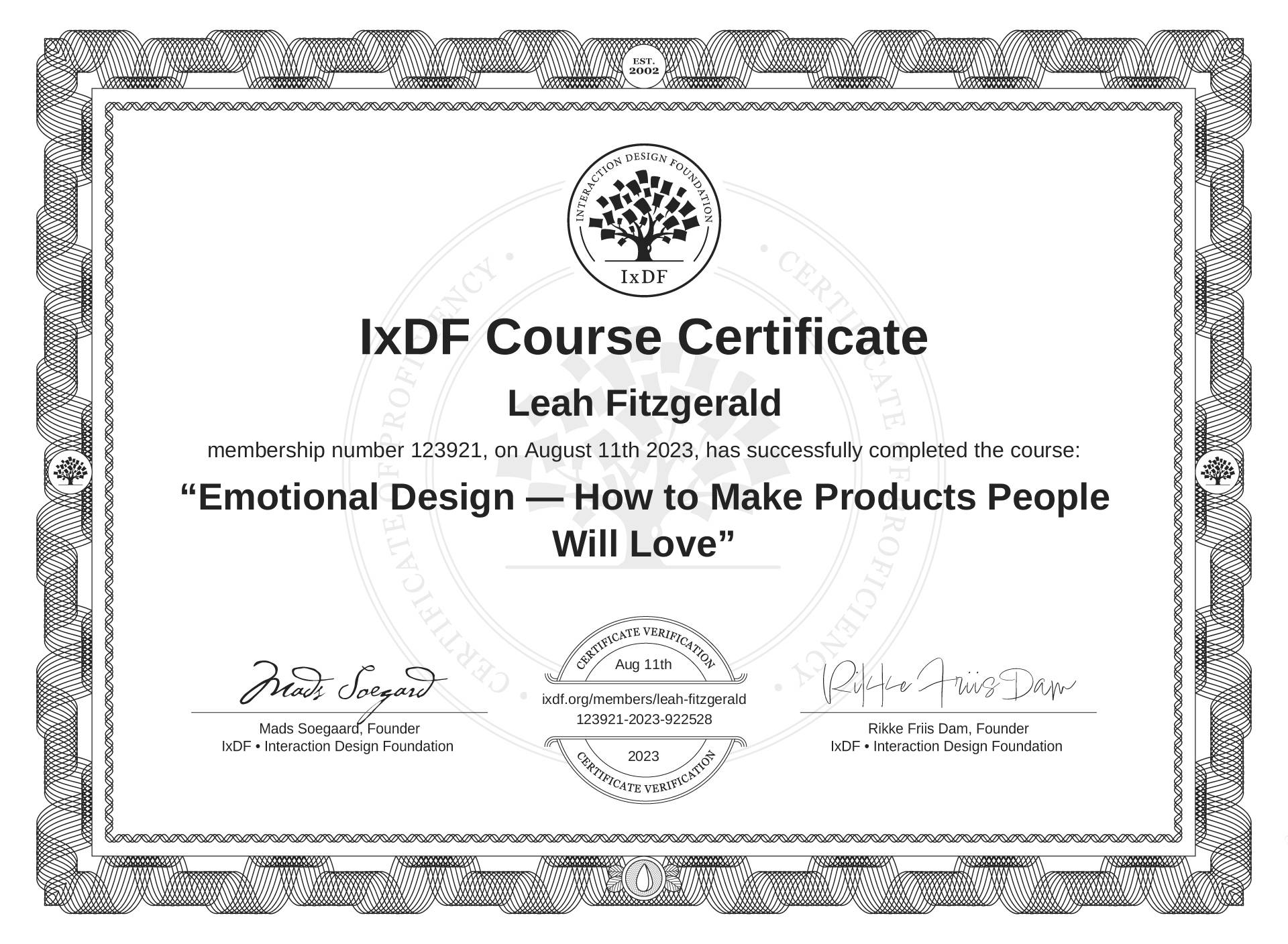 Leah Fitzgerald's Course Certificate: Emotional Design — How to Make Products People Will Love