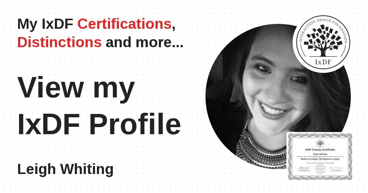 IxDF Course Certificates are awarded to Leigh Whiting in formal recognition of their coursework surpassing the rigorous benchmarks of exceptional performance established by the IxDF Educational Codex.
