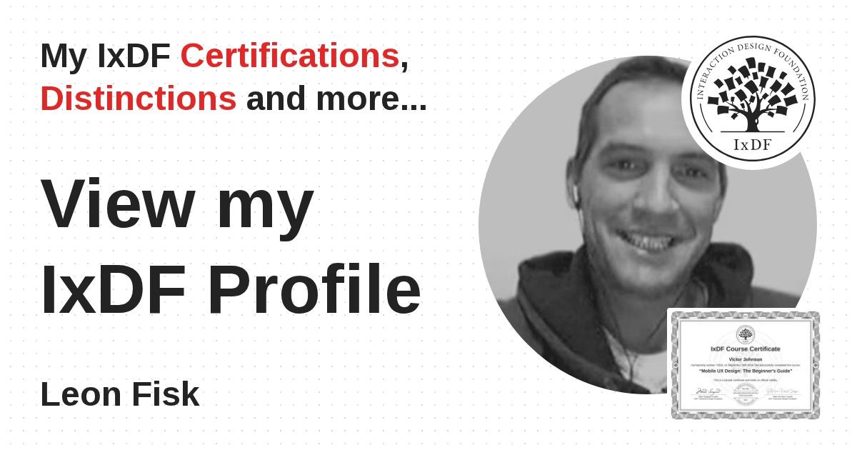 IxDF Course Certificates are awarded to Leon Fisk in formal recognition of their coursework surpassing the rigorous benchmarks of exceptional performance established by the IxDF Educational Codex.