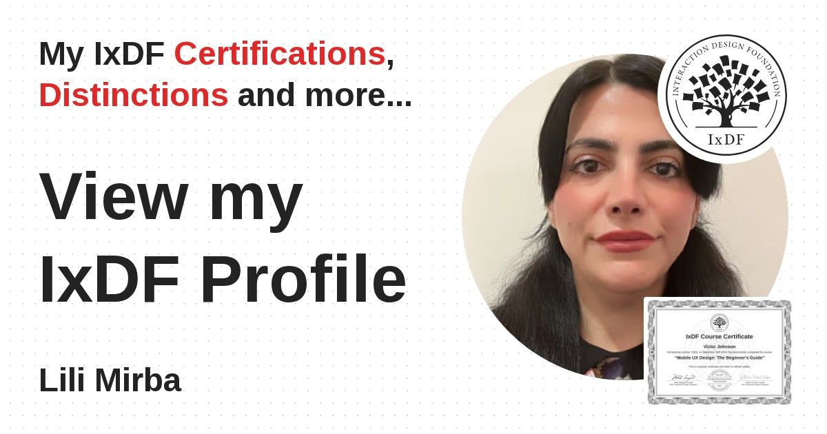 IxDF Course Certificates are awarded to Lili Mirba in formal recognition of their coursework surpassing the rigorous benchmarks of exceptional performance established by the IxDF Educational Codex.