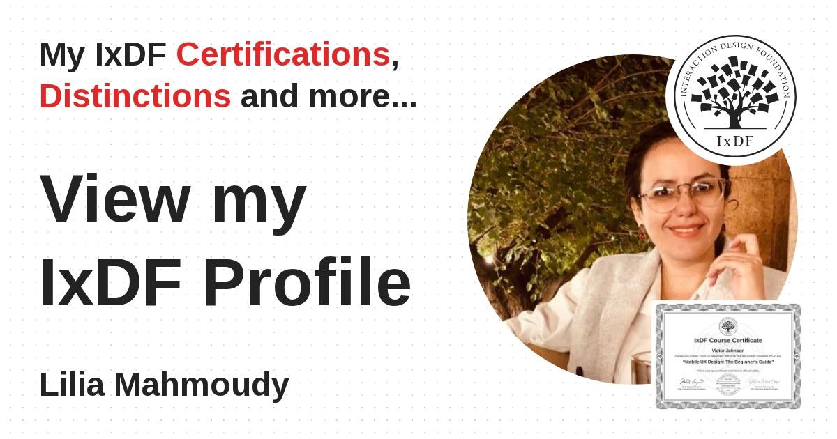 IxDF Course Certificates are awarded to Lilia Mahmoudy in formal recognition of their coursework surpassing the rigorous benchmarks of exceptional performance established by the IxDF Educational Codex.
