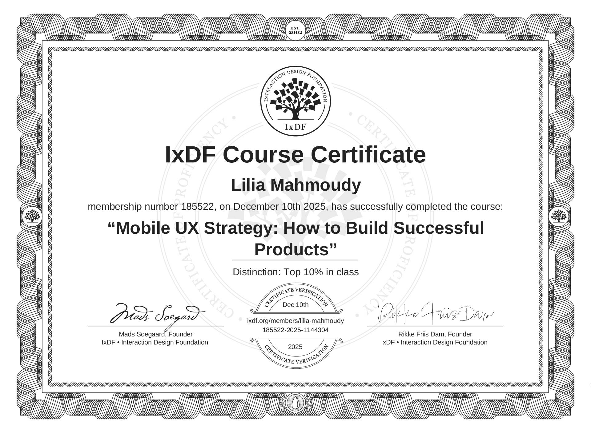 IxDF Course Certificates are awarded to Lilia Mahmoudy in formal recognition of their coursework surpassing the rigorous benchmarks of exceptional performance established by the IxDF Educational Codex.