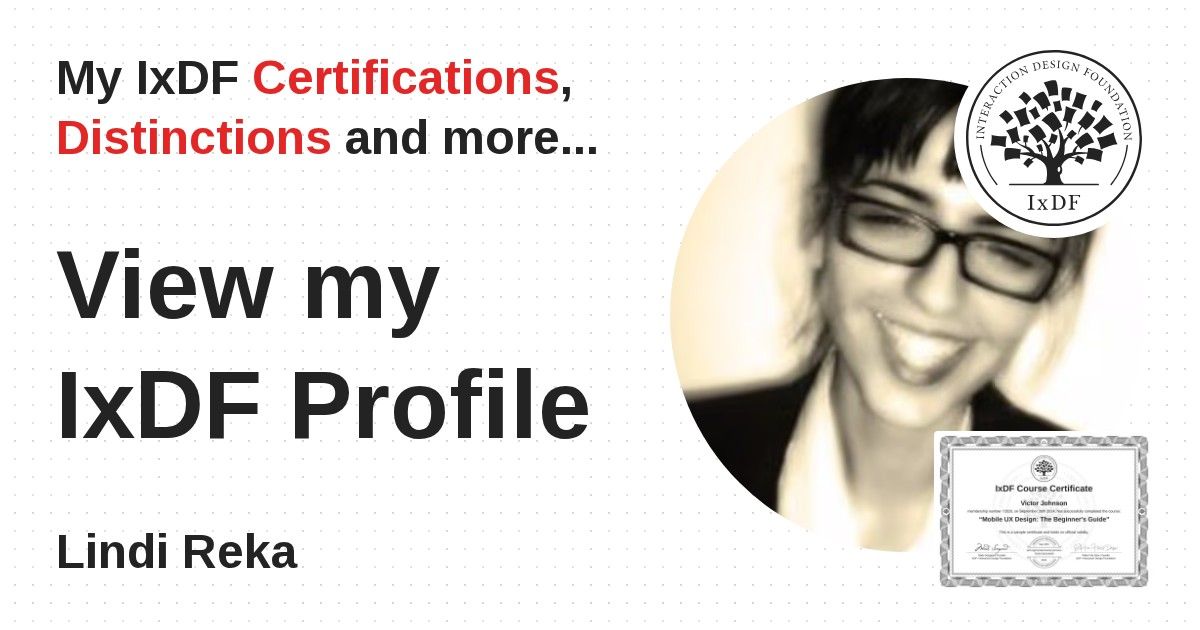 IxDF Course Certificates are awarded to Lindi Reka in formal recognition of their coursework surpassing the rigorous benchmarks of exceptional performance established by the IxDF Educational Codex.
