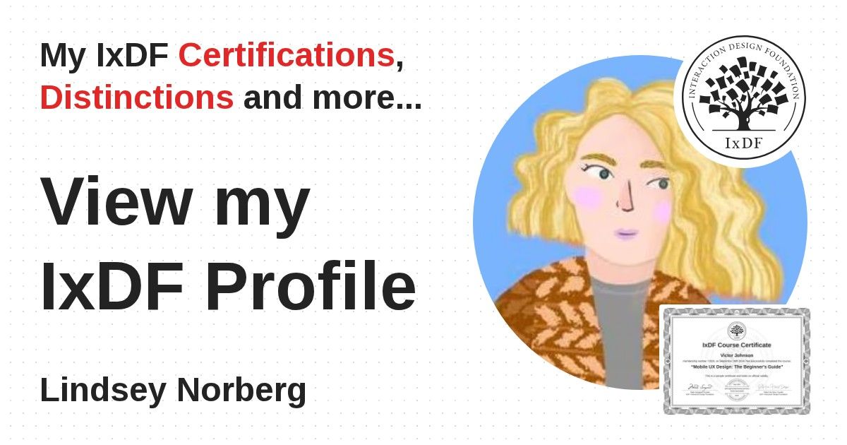 IxDF Course Certificates are awarded to Lindsey Norberg in formal recognition of their coursework surpassing the rigorous benchmarks of exceptional performance established by the IxDF Educational Codex.