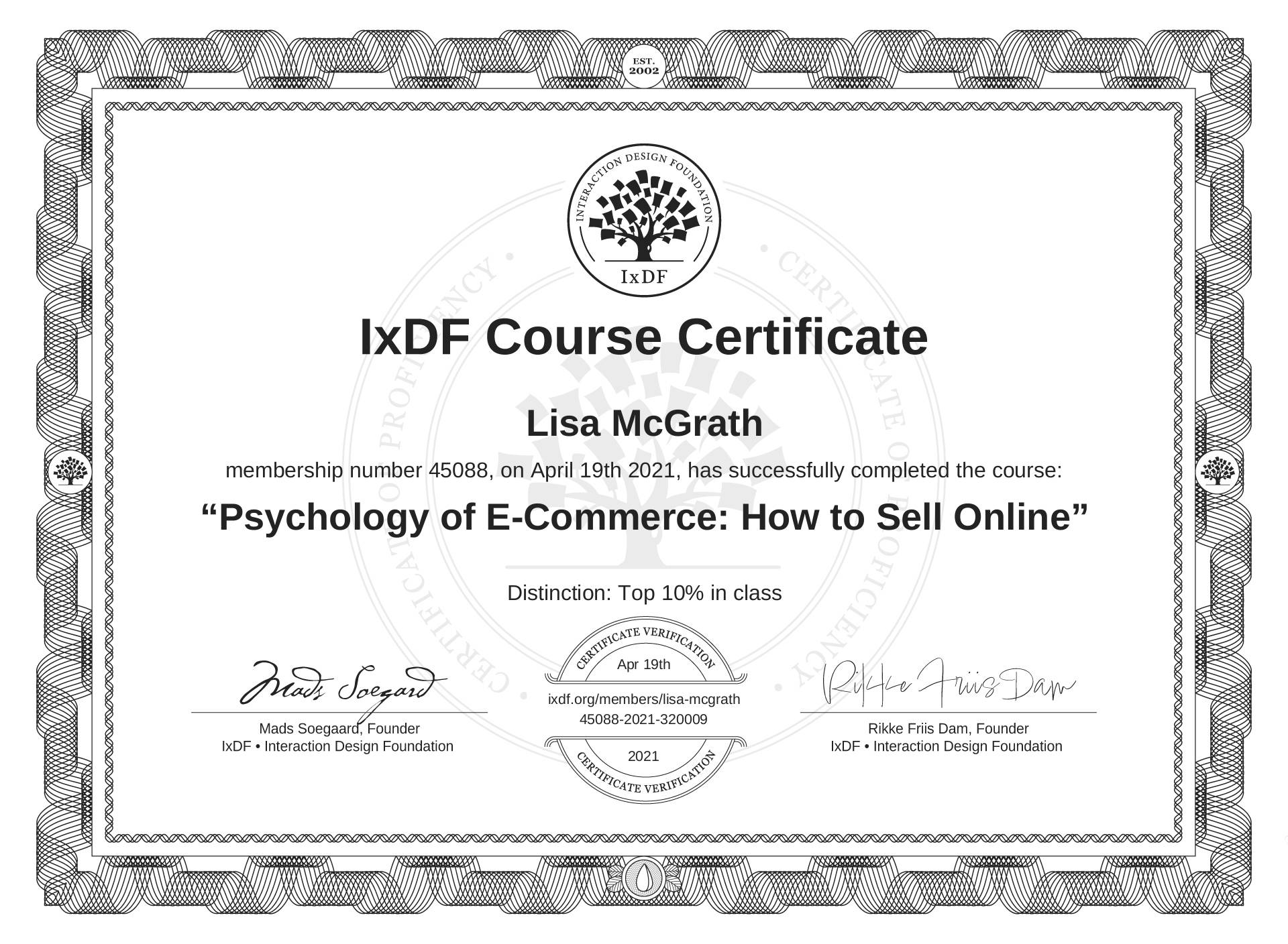 The IxDF Course Certificate (ID #f59846a2-60a5-42b9-b62a-778099c03b09) above is awarded to Lisa McGrath with a Top 10% Distinction in formal recognition of their coursework surpassing the rigorous benchmarks of exceptional performance established by the IxDF Educational Codex. View Course Curriculum.