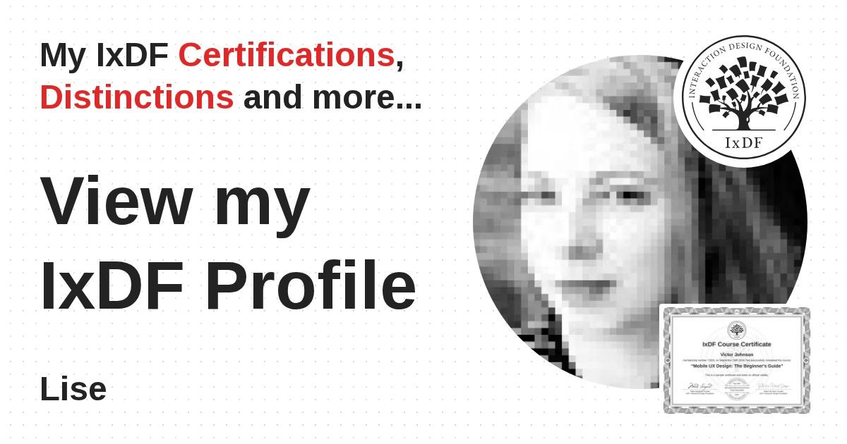 IxDF Course Certificates are awarded to Lise in formal recognition of their coursework surpassing the rigorous benchmarks of exceptional performance established by the IxDF Educational Codex.