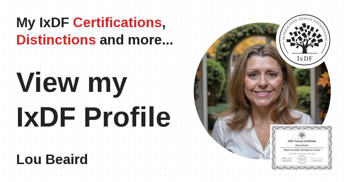 IxDF Course Certificates are awarded to Lou Beaird in formal recognition of their coursework surpassing the rigorous benchmarks of exceptional performance established by the IxDF Educational Codex.